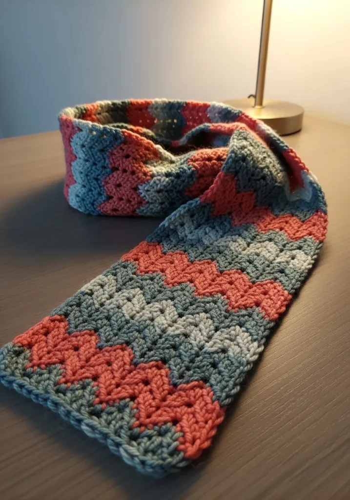 This eye-catching scarf uses a classic zigzag ripple stitch to blend shades of dusty rose, sage green, and cool slate blue. The texture is wonderfully dense and squishy, providing that much-needed warmth during those chilly morning commutes or brisk evening walks. It features a medium-weight yarn that keeps the peaks and valleys of the pattern looking sharp and defined. The playful geometric design, combined with the sophisticated color palette, makes it a versatile accessory that can easily dress up a basic winter coat.