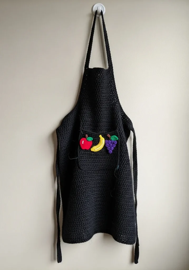 This sleek, full-length apron is crocheted in a deep jet-black yarn, giving it a professional and modern look that hides kitchen messes beautifully. It features a classic bib style with a convenient front pocket, which is the star of the show. The pocket is adorned with three vibrant crochet appliqués: a bright red apple with a tiny green leaf, a sunny yellow banana, and a cluster of rich purple grapes. The tight, uniform stitching provides a durable fabric that can withstand the heat of the kitchen while staying soft and flexible.