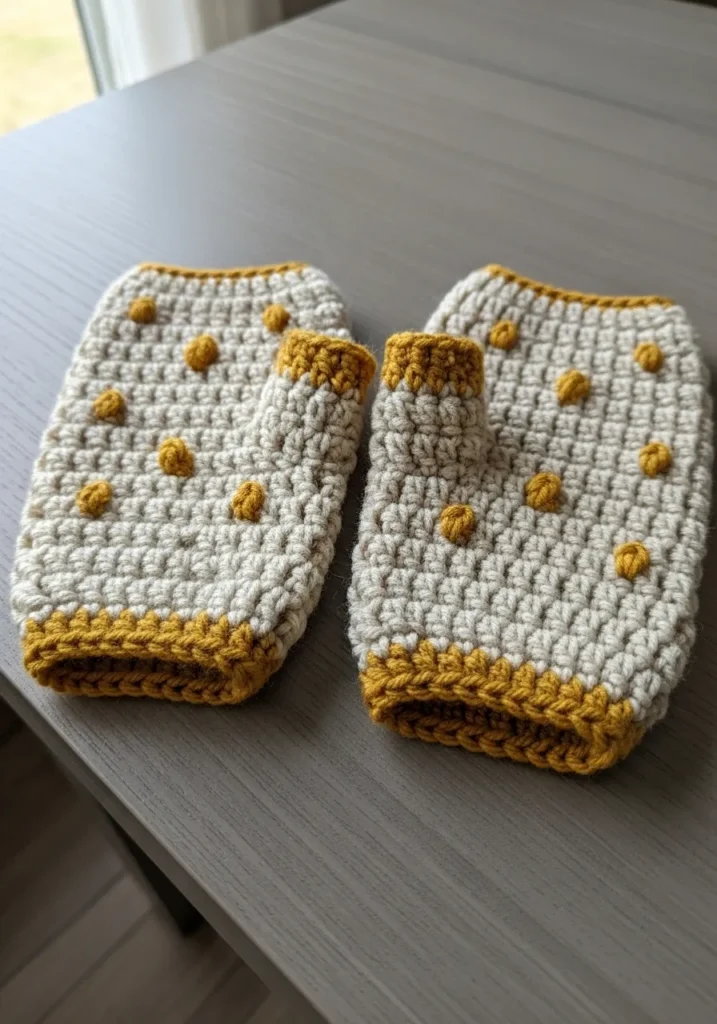 These darling fingerless gloves are crafted from a heathered oatmeal yarn that feels incredibly soft against the skin. They feature an adorable raised bobble stitch in a rich mustard yellow, which creates a fun 3D polka dot effect across the back of the hand. The cuffs and thumb holes are finished with a matching golden trim that gives the set a really high-end and professional look. With their thick and sturdy crochet construction, they offer plenty of warmth while leaving your fingers free to type or text.