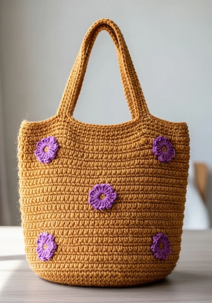 This sturdy tote bag is crocheted with a thick ochre cotton yarn that gives it a wonderful earthy look and plenty of durability. The body of the bag features tight and uniform stitches to ensure it can hold plenty of weight without stretching out of shape. It is embellished with several layered purple flower appliqués that add a beautiful pop of color and a whimsical garden vibe. The handles are reinforced with extra stitching for comfort and strength, making the whole design as practical as it is stylish.