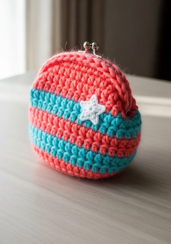 This petite circular pouch features vibrant horizontal stripes in coral pink and electric turquoise. The yarn has a slightly fuzzy and halo-like texture that makes it feel extra soft to the touch. A tiny white star appliqué is nestled on the side, adding a magical and celestial flair to the design. It is finished with a sturdy silver metal kiss-lock clasp that gives the whole accessory a charming vintage feel while keeping all your treasures secure.
