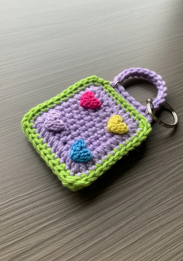 This adorable square keychain is a tiny masterpiece of color and texture. It features a soft lavender center framed by a bright lime green border, which gives it a fresh and energetic look. The focal point is a cluster of four miniature crocheted hearts in vibrant shades of hot pink, sunny yellow, sky blue, and a matching lilac. The tight single crochet stitches create a firm and durable fabric that can handle being tossed into a purse every day. It’s finished with a sturdy purple yarn loop and a classic silver ring to keep your keys safe and stylish.