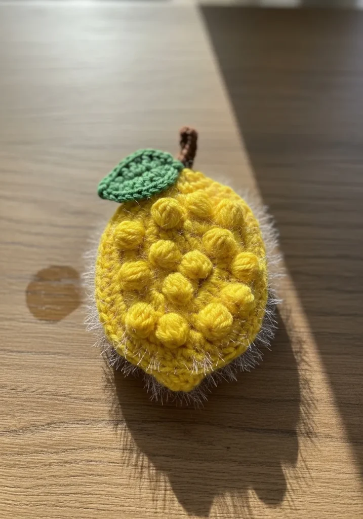 This bright little crochet lemon is bursting with texture and charm. Made with sunny yellow yarn and raised bobble stitches to mimic juicy pulp, it is finished with a tiny green leaf and a short brown stem for that fresh picked look. The tight stitches give it a sturdy feel while the playful 3D details make it stand out beautifully against a simple wooden surface.