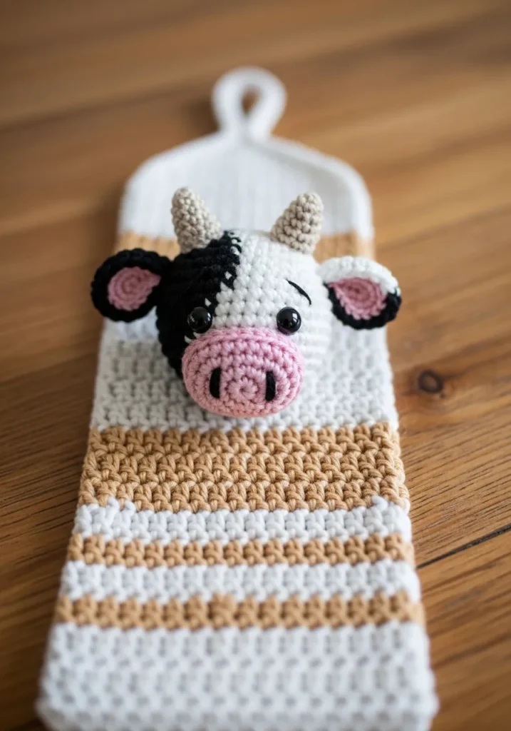 This crochet kitchen towel features a striped base in soft neutrals topped with an adorable amigurumi cow head. The pink snout, tiny horns, and little ears bring it to life, while the attached loop makes it easy to hang. The stitches are even and slightly textured, giving it that cozy farmhouse feel.
