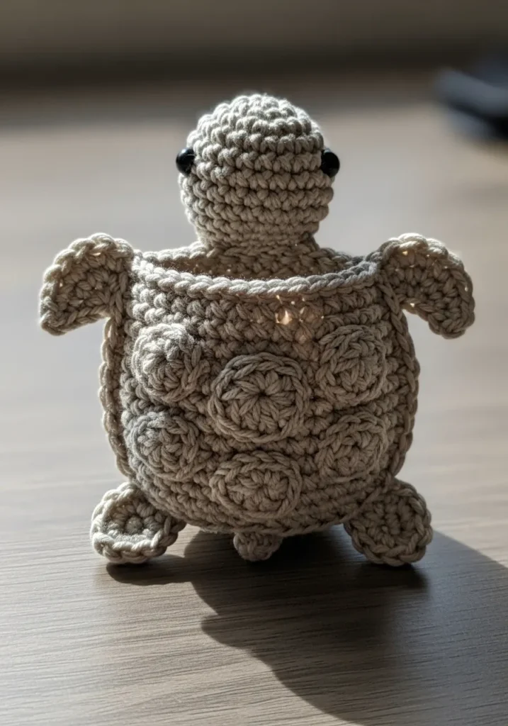 This crochet turtle is designed in a soft neutral beige yarn with a beautifully textured shell made from raised circular stitch motifs. The body forms a hollow pocket that can hold small items like keys, coins, or little notes, making it both decorative and practical. Tiny sturdy legs, a rounded head with glossy black eyes, and a slightly open top give it structure while keeping that adorable handmade charm.