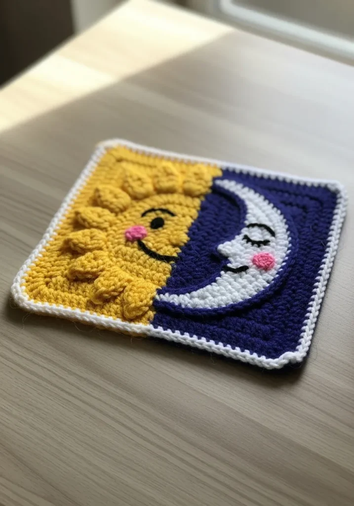 This crochet square features a split design with a bright yellow smiling sun on one side and a deep blue moon on the other. The facial details are stitched in contrasting yarn, giving each half its own personality. The square shape keeps it structured while the bold colors make it stand out beautifully.
