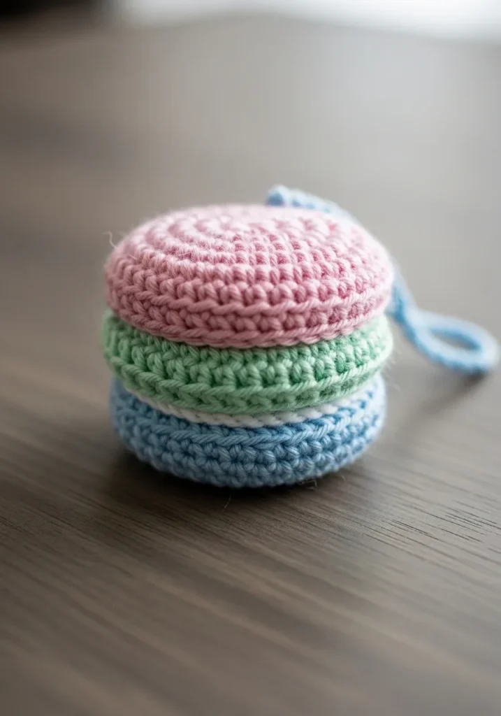 This tiny crochet pouch is shaped like a sweet little macaron, worked in soft pastel layers of pink, mint, and baby blue. The rounded shape is neatly stitched with tight, even rows that give it that classic sandwich cookie look, and a small loop detail adds practicality. The color blocking makes it look almost edible while still feeling cozy and handmade.