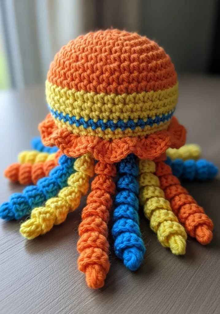 This cheerful crochet octopus is bursting with color, featuring a bright orange top and dangling tentacles in rainbow shades of blue, yellow, green, and red. The stitches are snug and rounded, giving the body a smooth dome shape while the curly tentacles add fun texture and movement. The bold stripes make it lively and eye catching.