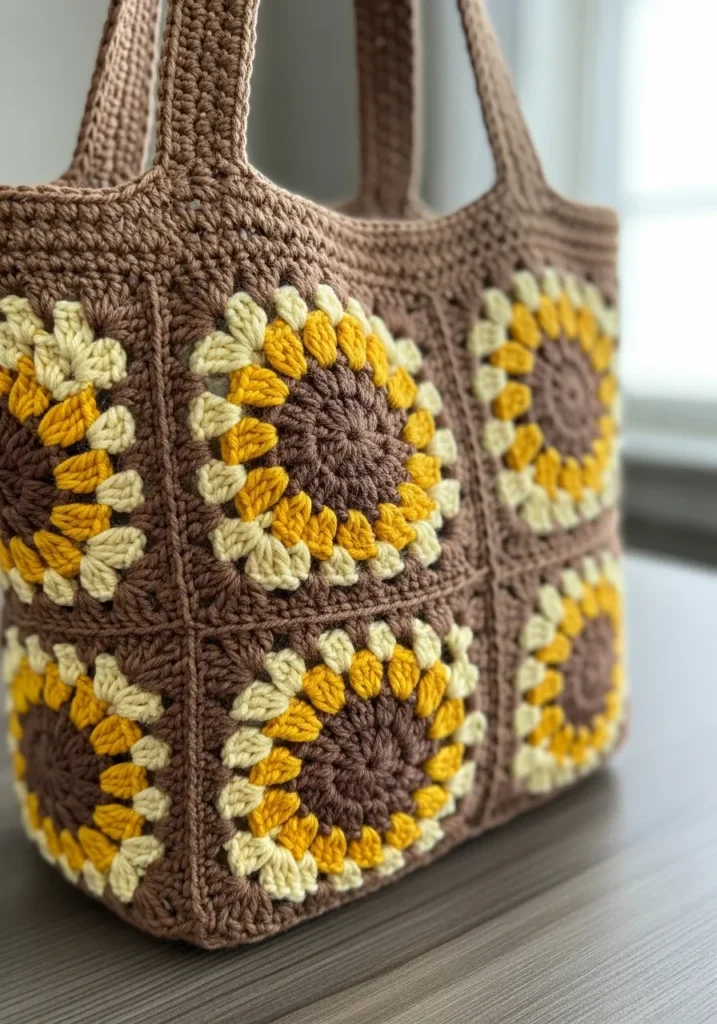 This crochet tote bag is made from classic granny squares featuring bold sunflower motifs in golden yellow and rich brown, framed by neutral borders. The sturdy handles match the base color, giving it structure while still letting the floral pattern shine. The textured stitches add depth and that lovely handmade charm.