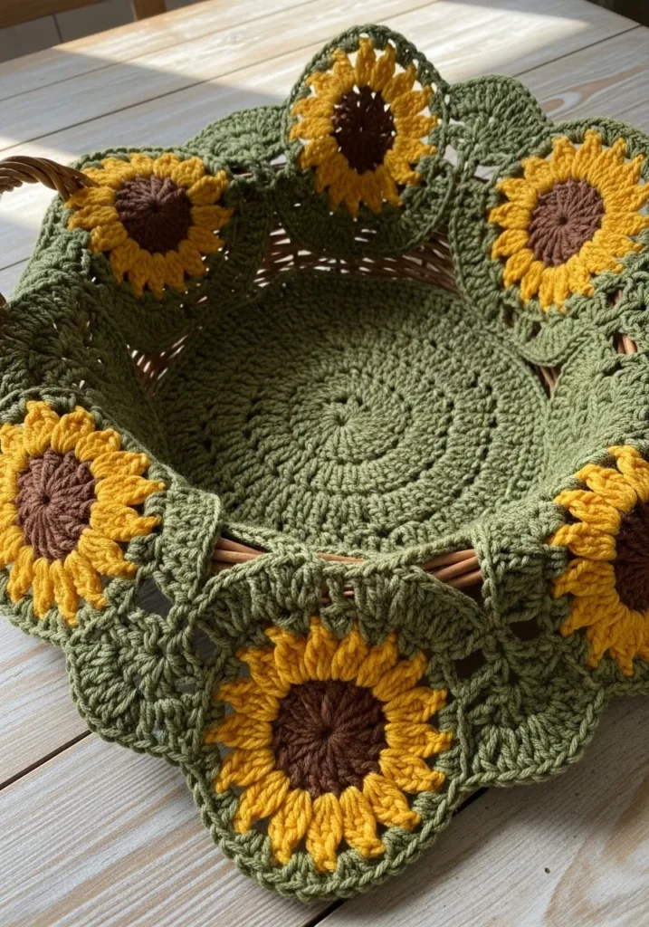 This crochet basket bowl is decorated with raised sunflower appliqués circling the outer edge in warm yellow and earthy brown tones. The base is worked in a muted green, creating a garden inspired look that feels fresh and cozy. The sturdy stitches give it enough structure to hold small items while still feeling soft.