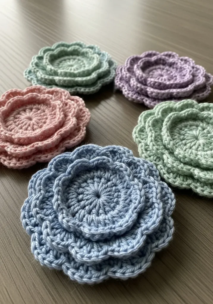 These crochet coasters are designed like blooming flowers, each worked in soft pastel shades with layered petal textures. The circular shape is enhanced by raised edges that give dimension and a delicate feel. The subtle color differences make each one unique while still cohesive as a set.