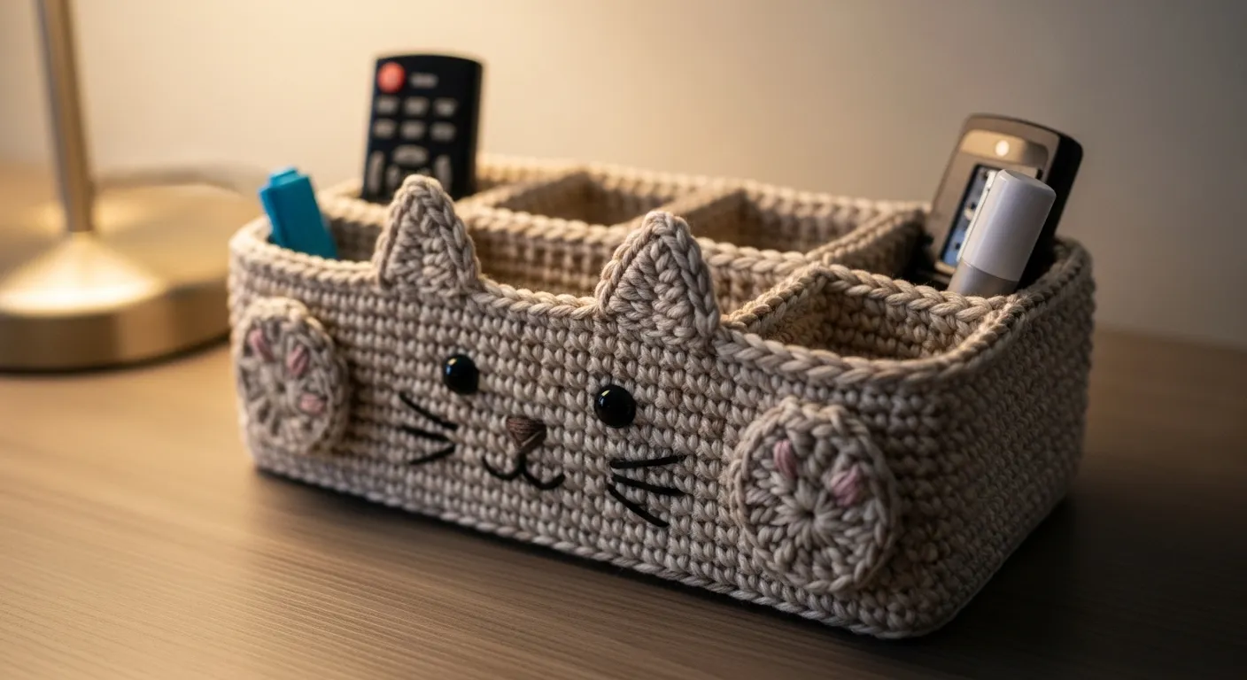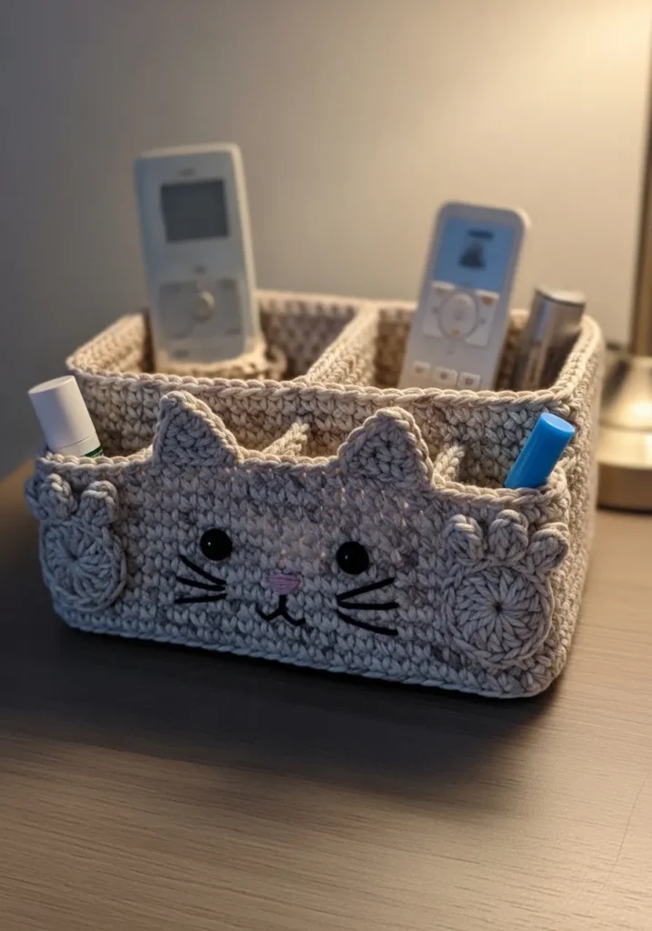 This adorable crochet basket features a sweet cat face complete with stitched whiskers, glossy safety eyes, and tiny ears peeking over the rim. Worked in a soft neutral yarn, the chunky stitches create a sturdy rectangular shape with divided sections inside for remotes or stationery. Little paw appliqués on the sides give it that extra dose of personality.