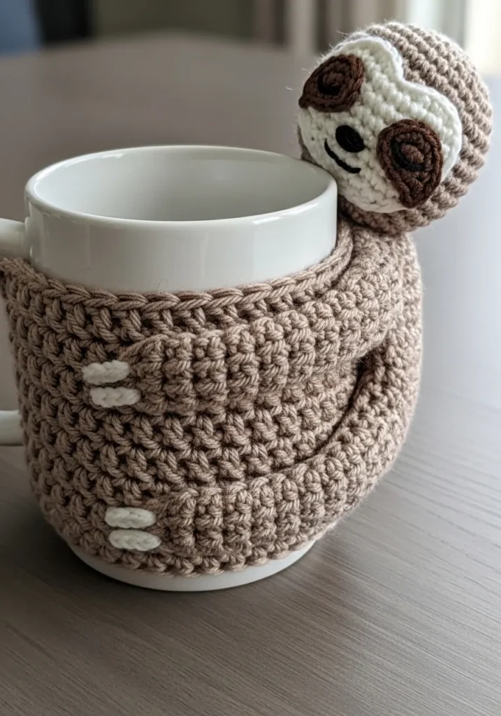 This cozy crochet plant cover wraps around a pot like a sleepy sloth giving it a gentle hug. Made in warm beige and brown tones, it features a tiny amigurumi sloth head resting over the rim with stitched facial details and little arms attached to the body of the cover. The textured stitches add depth while keeping the shape snug and secure around the pot.