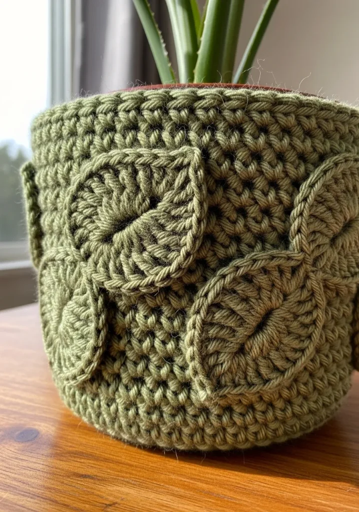 This crochet plant pot cover is designed in soft sage green with raised leaf motifs spiraling around the body. The stitches are thick and slightly textured, giving it a cozy handmade look while still keeping a clean cylindrical shape. The layered leaves add subtle dimension without overwhelming the design.