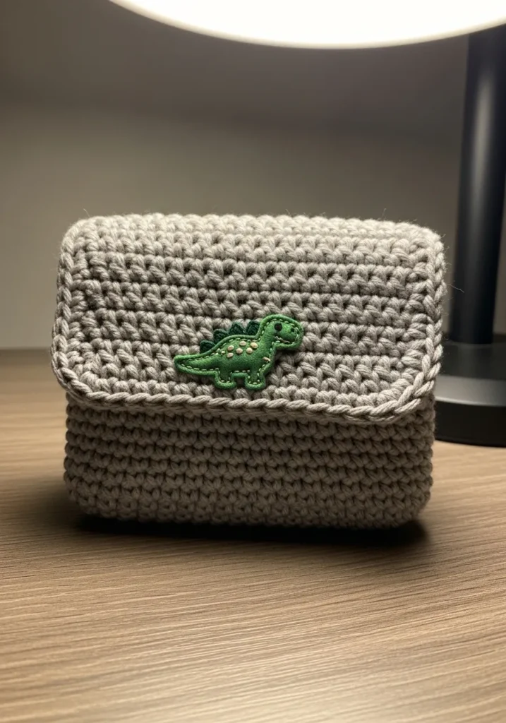 This small rectangular crochet pouch is worked in a neutral beige yarn with a flap closure and a tiny green dinosaur applique stitched on the front. The stitches are tight and uniform, giving it a neat boxy structure while the little dinosaur adds a fun pop of color and personality. It feels compact but sturdy enough for coins, earbuds, or small essentials.
