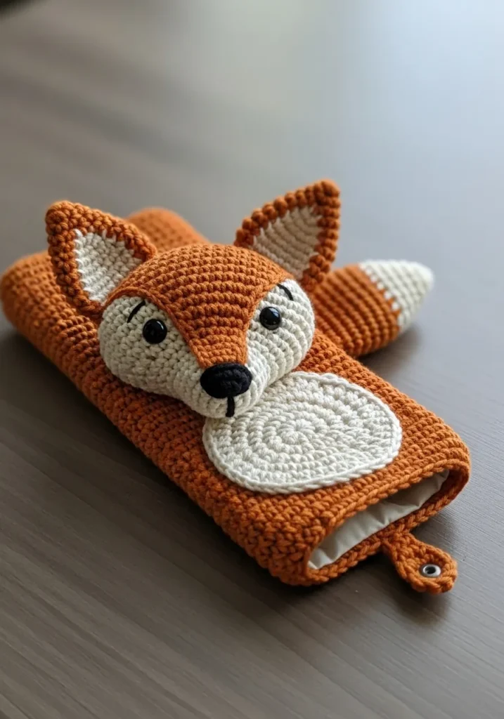 This crochet glasses case is shaped like a sweet little fox, complete with pointed ears, stitched eyes, and a cream colored snout detail. The warm orange yarn gives it a cozy woodland feel, and the flap closes neatly to keep glasses protected. The stitches are snug and structured, making it practical as well as adorable.