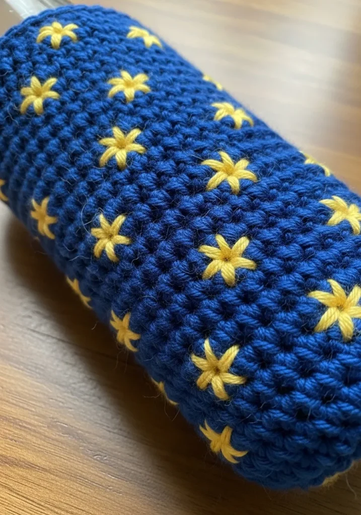 This crochet cord wrap is worked in deep navy blue with small yellow star stitches scattered across the surface. The rectangular shape folds neatly around cables, keeping them tidy while adding a whimsical celestial touch. The tight stitching keeps it structured and durable.