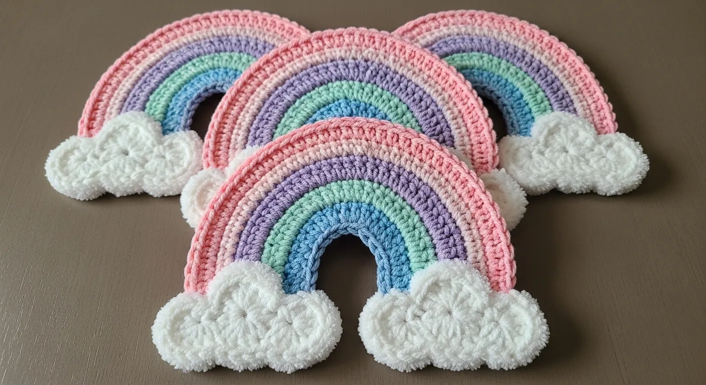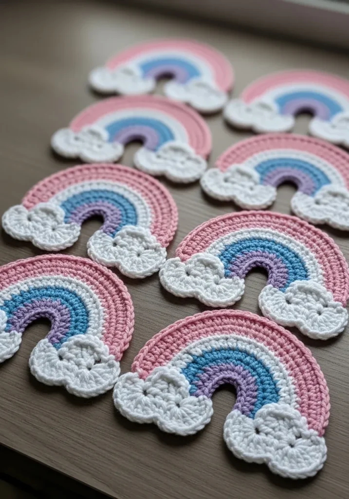 These crochet rainbow coasters are stitched in soft pastel shades of pink, lavender, mint, and baby blue, each finished with fluffy white cloud borders along the bottom. The arches are neatly layered with even rows of double crochet stitches, creating a smooth curved shape, while the cloud edging adds a slightly puffed texture that makes them feel extra cozy. The cotton yarn gives them structure so they hold their shape beautifully on a wooden table, and the soft color palette keeps everything light and cheerful.