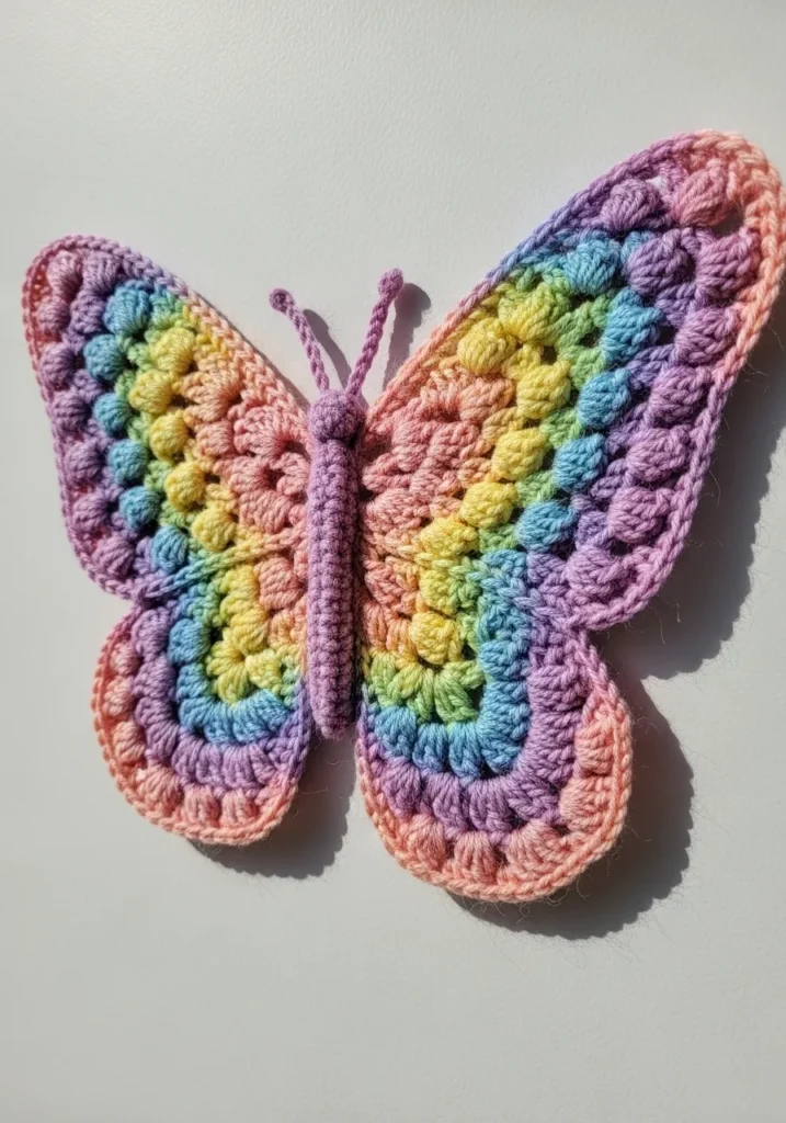 This crochet butterfly wall piece blends soft rainbow shades of pink, purple, mint, and yellow across its layered wings. The scalloped edges add dimension, and the stitched body down the center keeps the design symmetrical and balanced. The wings have subtle texture from the stitch pattern, making them look almost quilted.