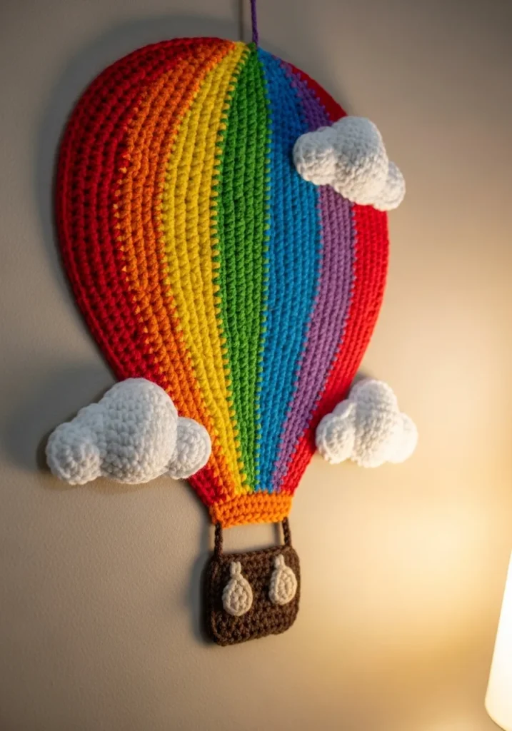This crochet hot air balloon wall piece is bursting with bold rainbow stripes in red, orange, yellow, green, blue, and purple, complete with tiny white cloud puffs stitched along the sides. The balloon shape is rounded and full, with neat rows of tight stitches that create a smooth surface, while the small brown basket hangs below with delicate yarn strands connecting it. The colors are bright and saturated, making the whole piece pop beautifully against a simple wall.