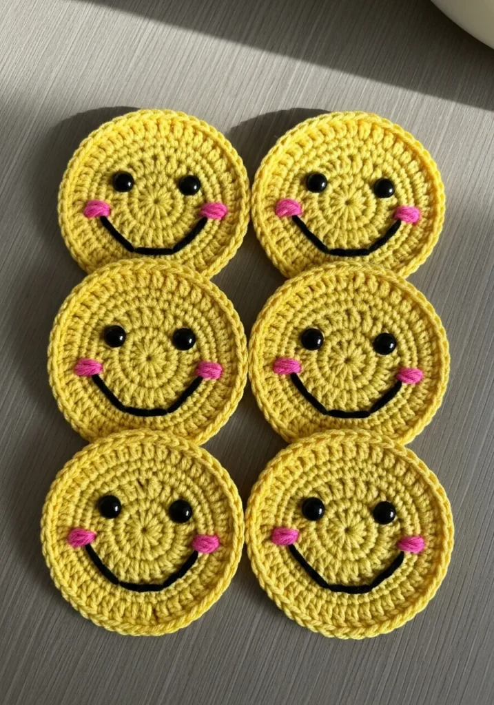 These crochet smiley coasters are stitched in cheerful yellow yarn with embroidered eyes and curved pink cheeks that give each one a sweet personality. The circular shape is clean and even, with tight stitches that keep them flat and practical for everyday use. The black stitched smiles stand out clearly against the sunny background, making them instantly eye catching.