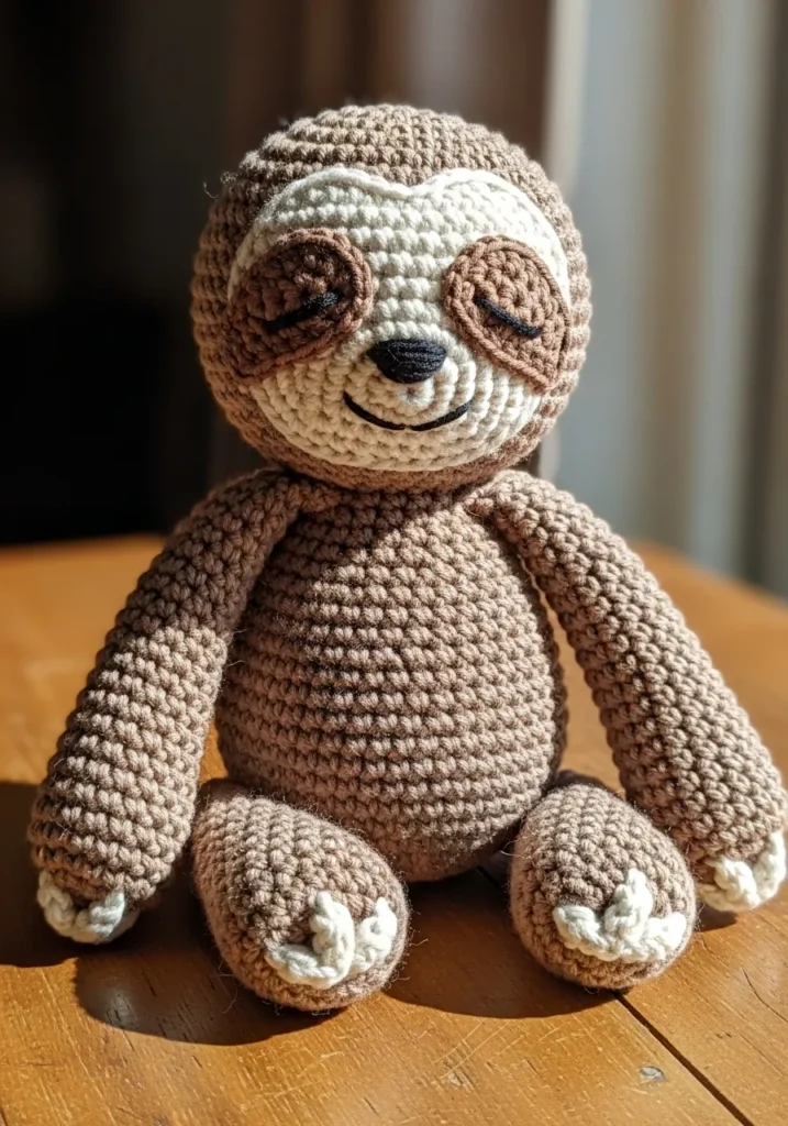 This crochet sloth plush is worked in soft beige and brown tones with gently curved arms and stitched facial details that give it a relaxed expression. The body is rounded and slightly squishy, with neat rows of stitches that keep everything smooth and uniform. Its little claws and shaded eye patches add depth without overwhelming the design.