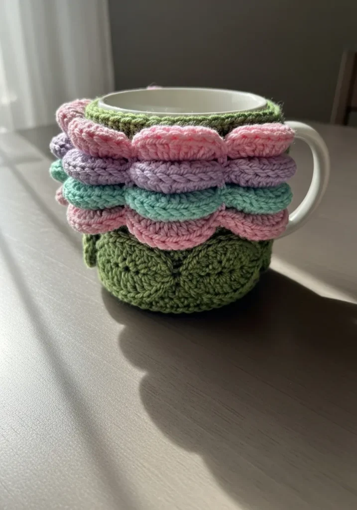 This crochet mug cozy features layered ruffles in pastel pink and mint green wrapped snugly around a simple cup. The stitches are tight and structured, while the scalloped edges add softness and dimension. The combination of textures makes the cozy look almost like a frosted cupcake wrapped around your mug.