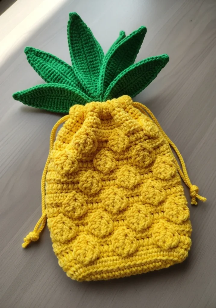 This crochet pineapple pouch is worked in bright yellow yarn with raised bobble stitches that create a fun textured pattern across the surface. The leafy green top flares out in pointed shapes, and the drawstring closure keeps the design practical. The overall shape is rounded and slightly structured so it stands upright easily.