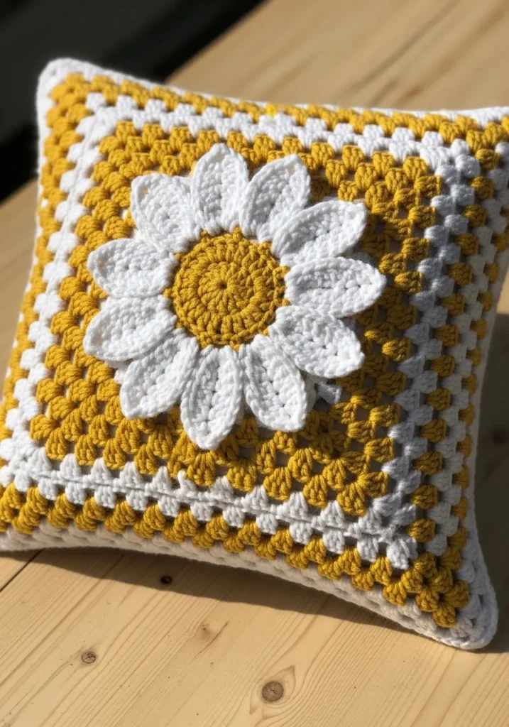 This crochet pillow features a bold granny square design with a bright mustard yellow center blooming into crisp white daisy petals. The outer border frames the flower in warm golden tones, and the chunky stitches add rich texture that makes the petals pop slightly off the surface. The yarn looks soft yet sturdy, giving the pillow a plush and inviting feel while still keeping those clean square edges.
