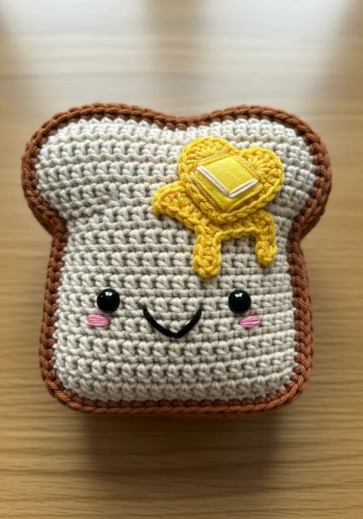 This crochet toast plush is designed in a soft beige yarn with a darker crust border and a tiny pat of yellow butter stitched right on top. The square shape has gently rounded corners, and the embroidered smile gives it tons of personality. The texture is simple and even, making the butter detail really stand out.
