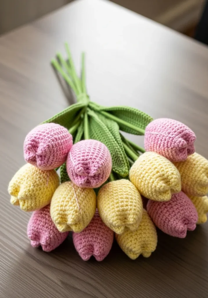 This crochet tulip bouquet features soft pink and buttery yellow blossoms with long green stems and leaves. Each flower head is gently rounded with tight, uniform stitches that give it a clean finish. The stems are slim but sturdy, allowing the bouquet to rest naturally on a table.