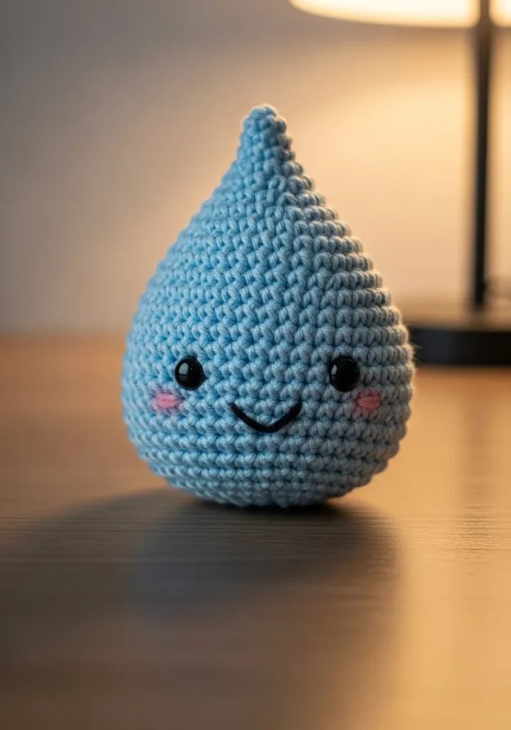 This crochet raindrop plush is shaped in a smooth teardrop form using soft blue yarn, with tiny embroidered eyes and a curved smile. The stitches are tight and consistent, giving it a clean silhouette. Its rounded base allows it to sit upright on a flat surface.