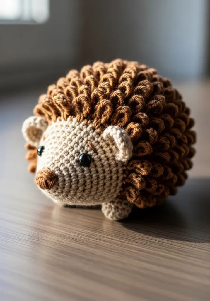 This crochet hedgehog plush combines a smooth beige face with tightly looped brown stitches forming its spiky back. The small round ears and stitched nose give it an endearing expression. The contrast between the soft body and textured spikes makes it visually interesting and cozy.