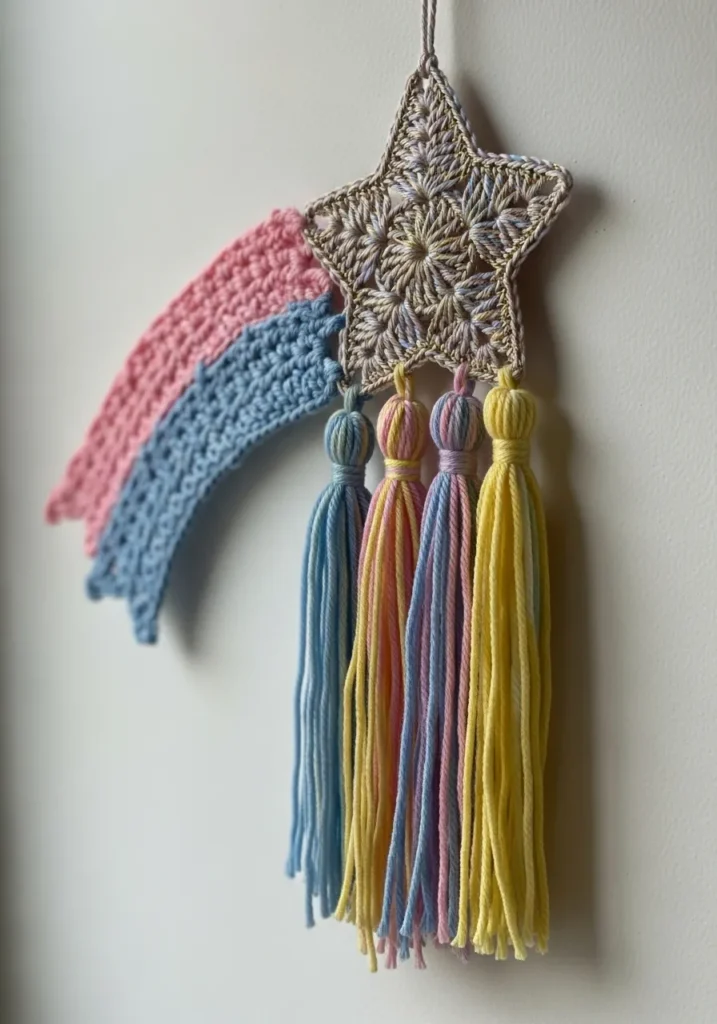 I absolutely adore how whimsical this piece feels. It looks like something straight out of a dreamy nursery or cozy craft corner. The mix of textures between the structured star and the soft draping tassels makes it so fun to create. I love projects like this because they feel impressive but are actually quite doable, and the color combinations can be customized to match any space.