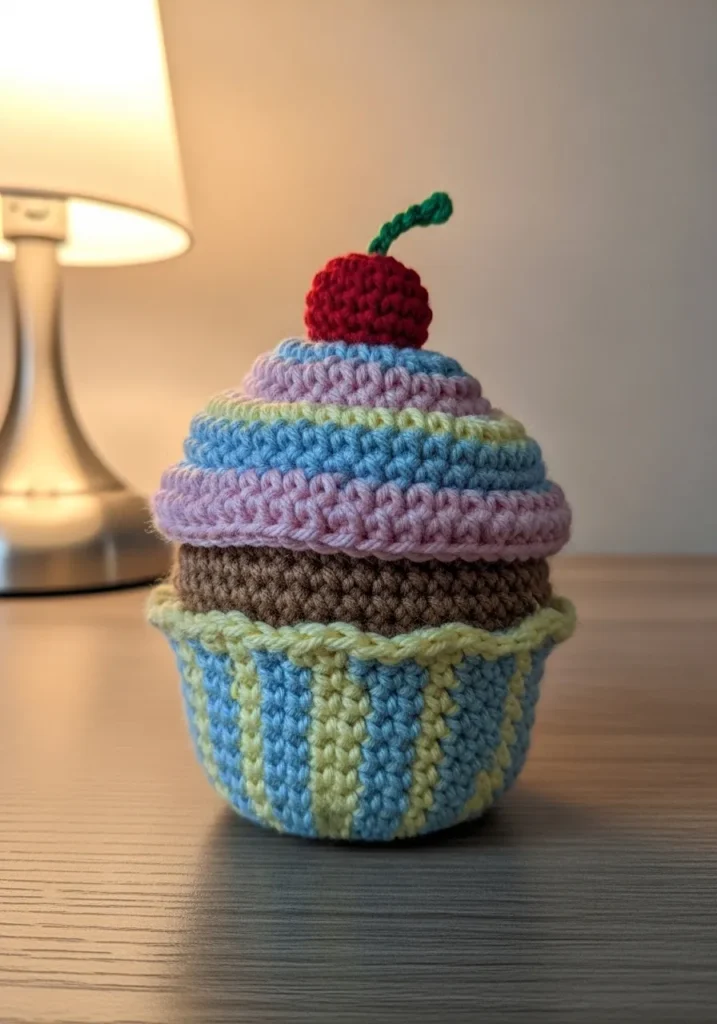 I always smile when I see crochet desserts like this. They feel whimsical and a little bit nostalgic, like something straight out of a cute bakery window. It is such a fun project to display on a shelf or gift to a friend who loves sweets but does not need more calories.