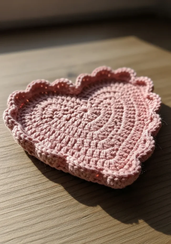 This heart shaped crochet dish is worked in soft blush pink yarn with raised swirl stitching that adds beautiful texture across the center. The scalloped edging gives it a delicate, almost lace like feel while still keeping its sturdy bowl shape. The thick yarn helps it hold structure so it can actually cradle small items without collapsing.