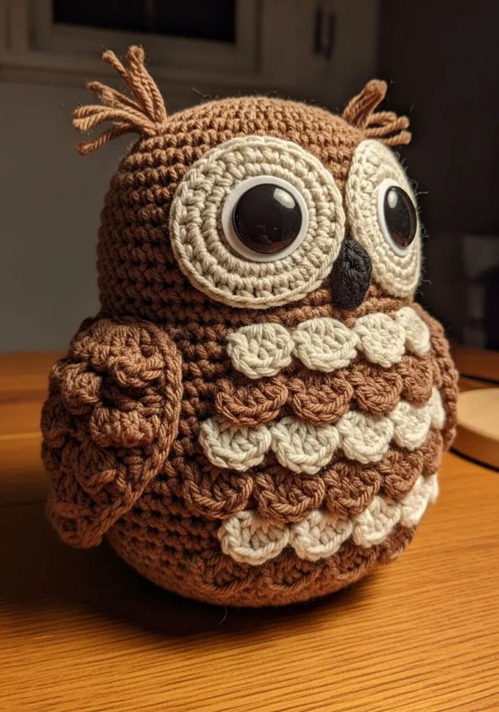 This charming crochet owl is stitched in layered shades of brown and cream, with oversized round eyes that instantly steal the spotlight. The body features scalloped rows that mimic feathers, giving it a rich textured look, while the tiny ear tufts on top add personality. The yarn appears soft and slightly chunky, which makes the owl look extra cuddly.