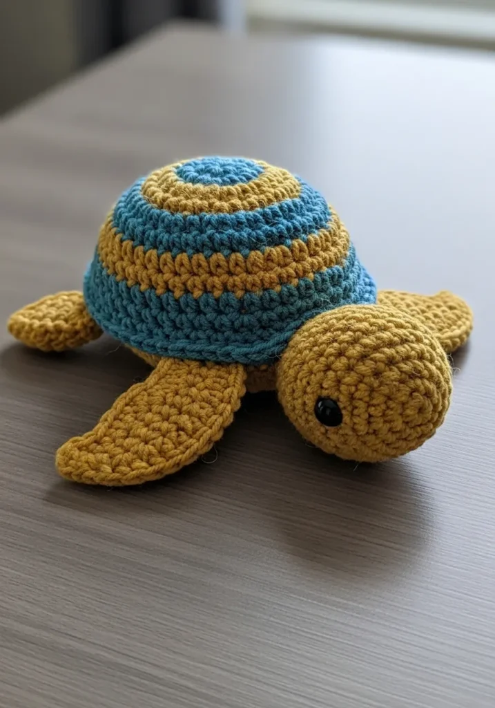 This small crochet turtle has a mustard yellow head and limbs with a striped blue and yellow shell on top. The shell is slightly domed and stitched in tidy rounds, while the flippers are flat and gently curved. The overall shape is compact and adorable, perfect for sitting on a desk or bedside table.