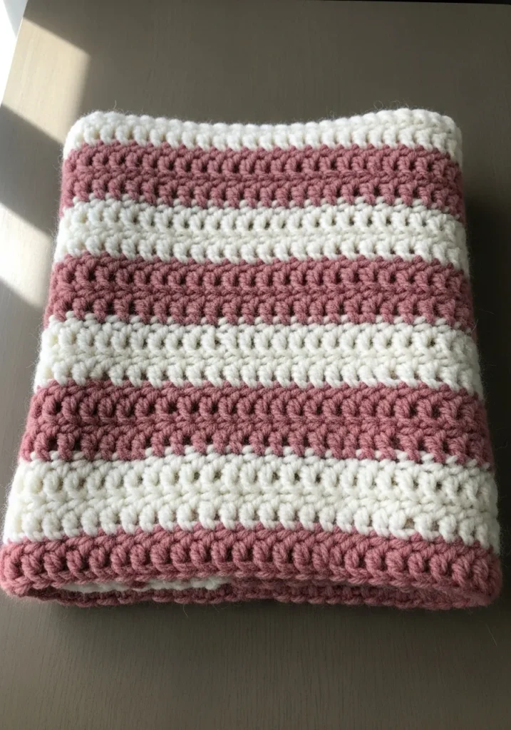 This folded masterpiece is the definition of “clean girl aesthetic” in the crochet world. It features crisp, alternating stripes of dusty rose and creamy white yarn that create a timeless look perfect for a modern nursery. The texture is wonderfully dense and even, showcasing a classic stitch like the half double crochet, which gives it that squishy, high-end feel without being too heavy. The edges are finished so neatly that it looks like it came straight from a boutique shelf rather than a yarn basket.