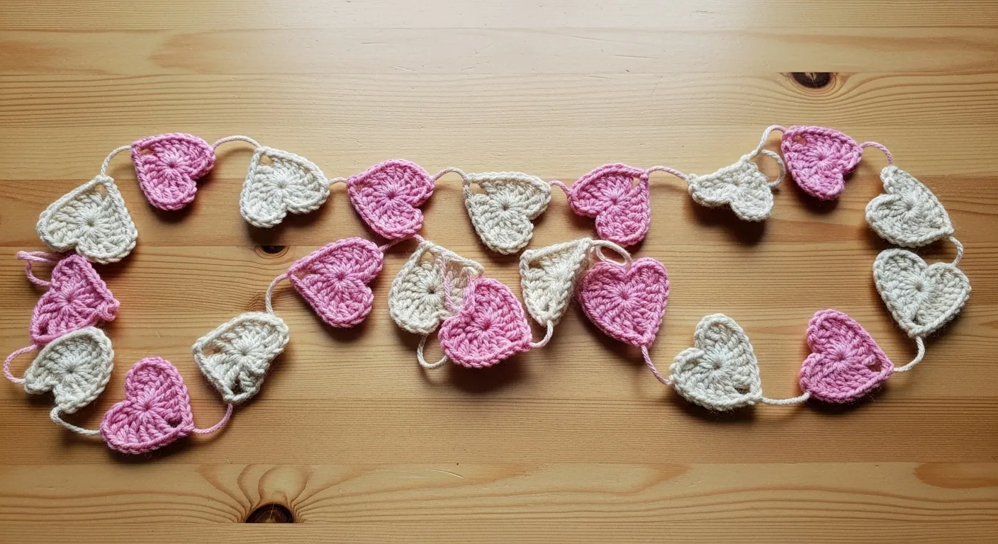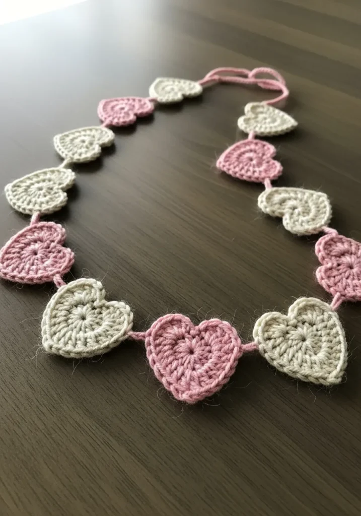This charming garland features a series of delicate crochet hearts in soft blush pink and creamy off-white tones. Each heart is worked in a simple circular pattern that transitions into a classic pointed shape with beautiful stitch definition. The hearts are strung together on a matching crochet chain, which creates a seamless and lightweight look perfect for draping over a mirror or a nursery bookshelf. The soft matte yarn gives the whole project a cozy and homemade feel without looking cluttered or messy.