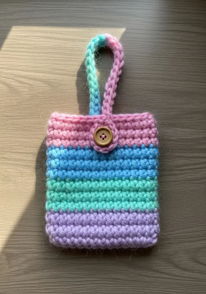 This charming little accessory is worked in a sturdy single crochet stitch that gives it a wonderfully thick and durable feel. The design features a dreamy sequence of lavender, mint green, sky blue, and soft pink stripes that transition seamlessly from bottom to top. A matching braided loop handle peeks out from the center, secured by a classic wooden button that adds a touch of rustic warmth to the vibrant colors. Its compact rectangular shape is perfectly sized for holding essentials like cards or a lip balm while keeping your hands free.