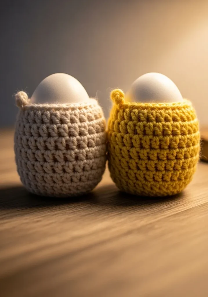 These darling little cozies feature a clean and modern aesthetic that instantly elevates a simple breakfast table. Handcrafted using a sturdy cotton yarn in soft cream and cheery mustard yellow, they showcase a beautifully tight single crochet stitch that provides a thick and protective structure. The design is wonderfully understated with a rounded base that hugs the egg perfectly and a tiny, delicate loop at the rim for easy removal. They offer a cozy tactile experience and a soft matte finish that makes everyday kitchenware feel like a curated boutique find.