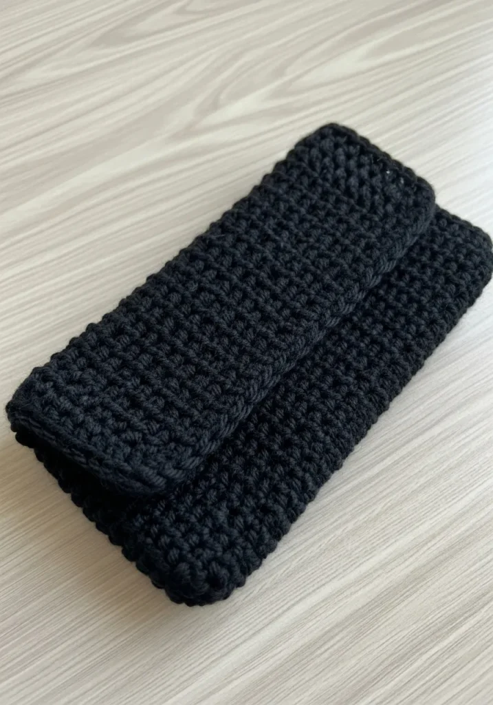 This sleek accessory is crafted from a deep charcoal cotton yarn that offers a soft yet protective home for your favorite frames. The design features a classic fold-over flap and a dense, uniform stitch that creates a sturdy cushioned barrier against scratches. Its dark matte finish and chunky tactile surface give it a modern, sophisticated look that fits perfectly in a handbag or on a nightstand. The clean lines and simple envelope shape prove that a functional item can also be a total style statement.