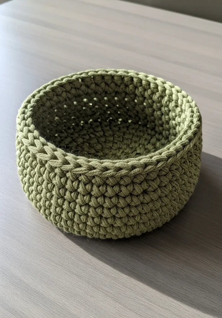 This sturdy little basket is a total game-changer for anyone who wants to hide their clutter in style. It features a gorgeous sage green hue and a thick, rope-like cotton yarn that gives it a sophisticated, architectural feel. The stitch work is incredibly dense and uniform, creating those beautiful little V-shapes that stack up perfectly to form a rigid wall. It is finished with a clean, braided edge along the rim which makes the whole piece look like something you’d find in a high-end boutique. The texture is wonderfully tactile and firm, so it holds its shape perfectly whether it’s sitting on your entryway table or holding yarn in your craft nook.