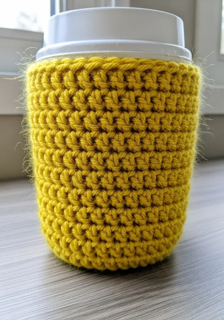 This bright mustard yellow coffee cozy features a dense and squishy moss stitch that provides the perfect amount of cushion for your favorite travel mug. The yarn has a slightly fuzzy, wool-blend look that keeps your hands protected from heat while feeling incredibly soft to the touch. It is designed as a seamless tube that hugs the curves of a standard reusable cup, finished with a clean top edge that keeps everything looking tidy and professional. The vibrant golden hue adds a cheerful pop of color to your morning routine and makes even a basic plastic cup look like a high-end accessory.
