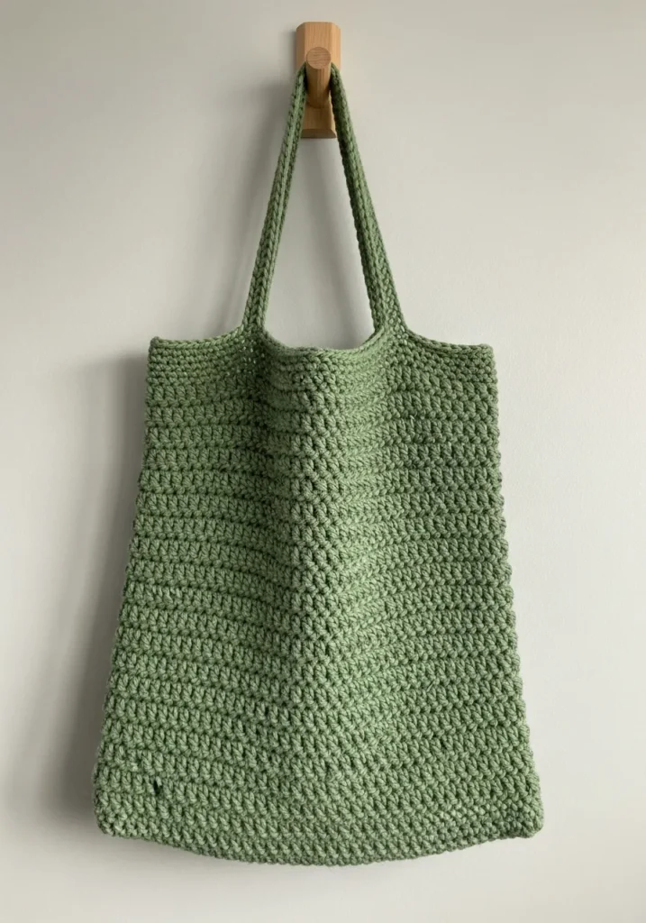 This minimalist market bag features a beautiful sage green hue that brings a calm and organic vibe to your accessories collection. The design uses a sturdy cotton yarn worked in a dense moss stitch or similar alternating pattern, which gives the fabric a thick and durable feel without any large holes for your keys to fall through. Its seamless body transitions smoothly into long and comfortable shoulder straps, making it both a practical workhorse and a stylish addition to a casual outfit. The soft matte finish of the yarn highlights the uniform rows and gives the whole piece a sophisticated, store-bought look.