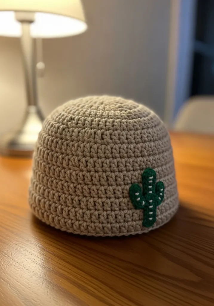 This crochet headband features a smooth beige band worked in tight, even stitches with a sweet little cactus appliqué stitched on one side in rich green yarn. The texture looks soft but structured, giving it a clean and modern shape that hugs the head comfortably. The tiny cactus detail adds just enough personality without overwhelming the neutral base, making it feel chic and playful at the same time.