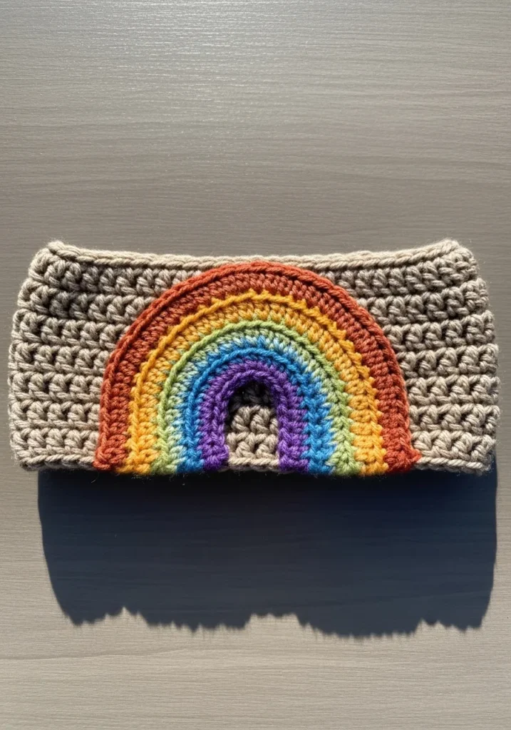 This crochet headband features a neutral beige base with a bold rainbow appliqué stitched across the front in rich, vibrant colors. Each stripe is carefully layered, creating dimension and a cheerful focal point. The overall look is playful yet balanced thanks to the soft background tone.