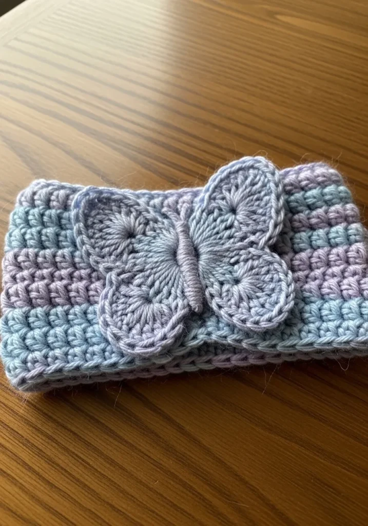 Soft stripes of pastel pink, mint, and lavender form the base of this crochet headband, topped with a delicate butterfly appliqué stitched in light gray. The stitches are neat and slightly ribbed, giving the band structure while keeping it cozy. The butterfly adds a gentle, whimsical touch.