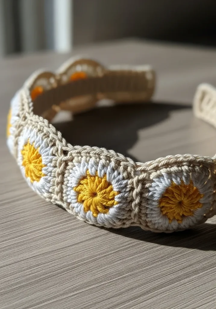 This cream crochet headband is decorated with a row of daisy motifs featuring bright yellow centers and white petals. The openwork between the flowers gives it a slightly vintage, lace inspired feel, while the cheerful florals keep it fresh and charming. The texture feels light but sturdy.